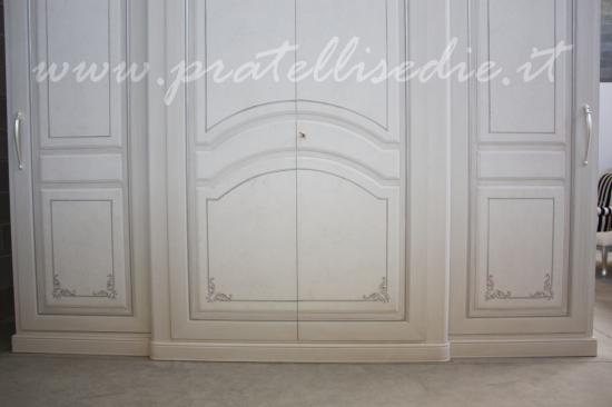 Le caratteristiche classiche di questo armadio quali il cappello a gendarme e il corpo avanzato, unite ad una finitura più contemporanea, un laccato rigato e spugnato arricchito da decori e bordi in foglia argento lo rendono un mobile elegante abbinabile ai comò in stile bombato moderno e a letti con imbottitura capitonnè o in ferro battuto.